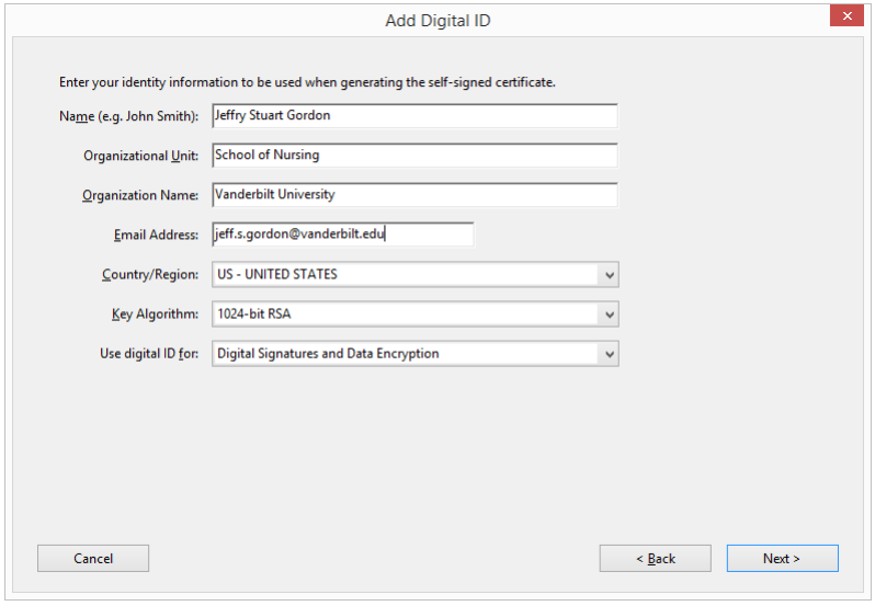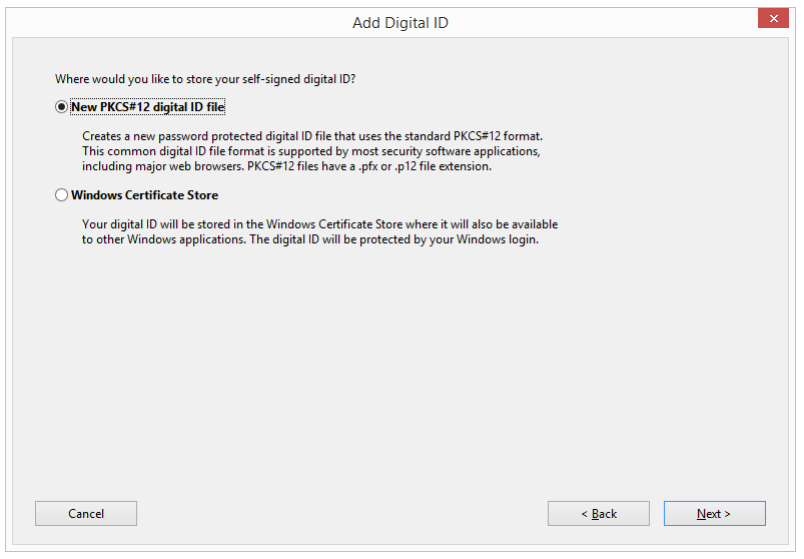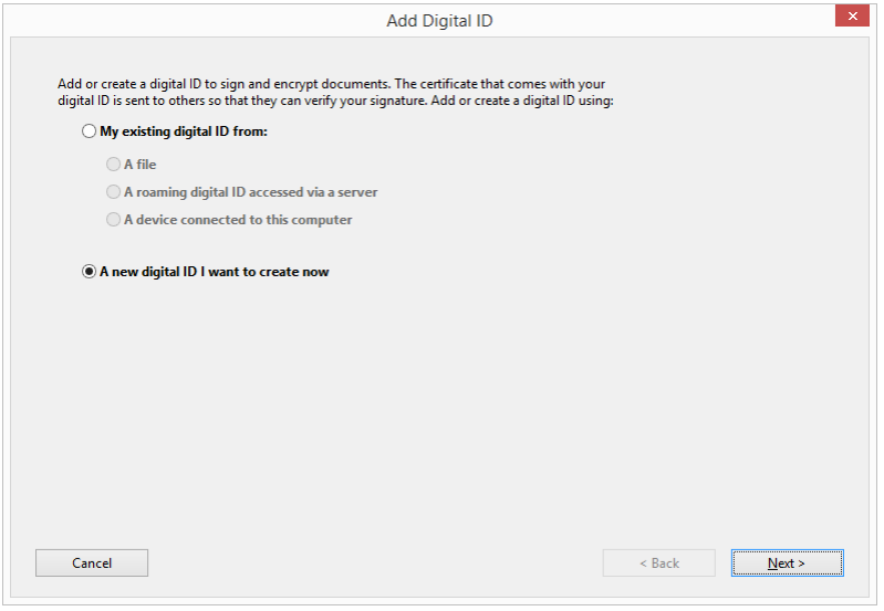 2. Click on the radio button next to A new digital ID I want to create now