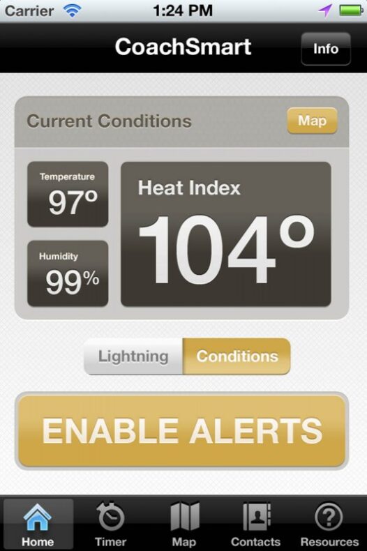 The free iPhone and Android app, called CoachSmart, is the ultimate resource for coaches, offering real-time information on heat index and lightning strikes, frequently asked sports medicine and safety questions, and a group contact feature.