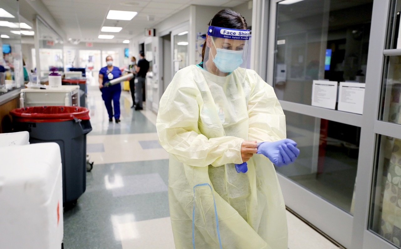 Holly Beth Jones puts on the personal protective equipment she needs as an Emergency Room nurse. Very different from a $5,000 wedding gown from Eve of Milady. Photo by Erin O. Smith