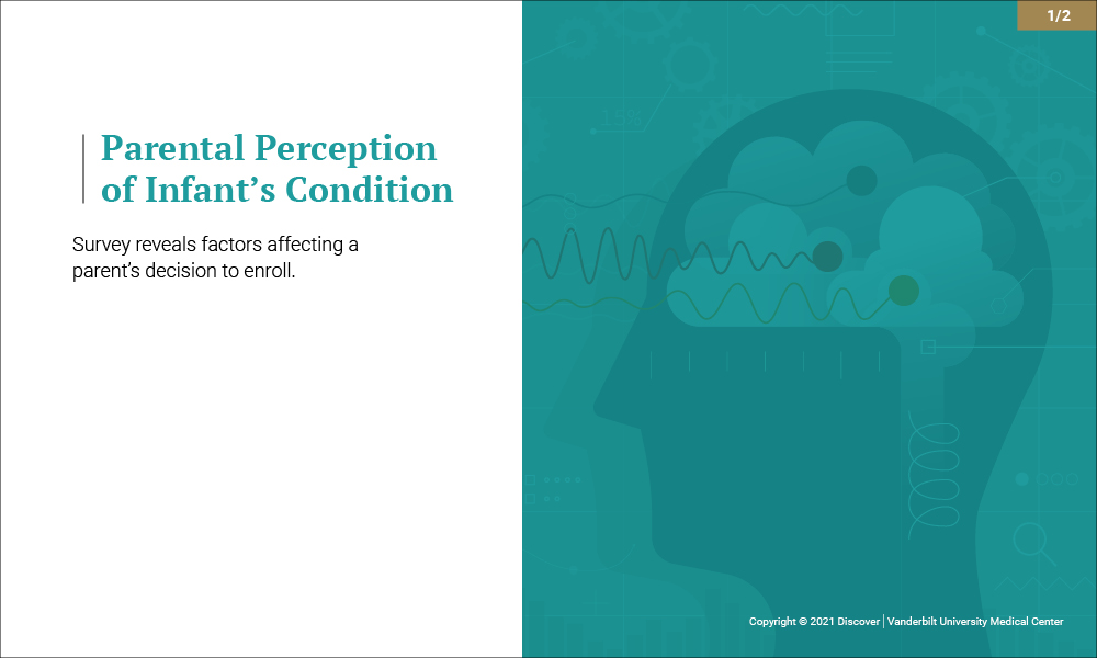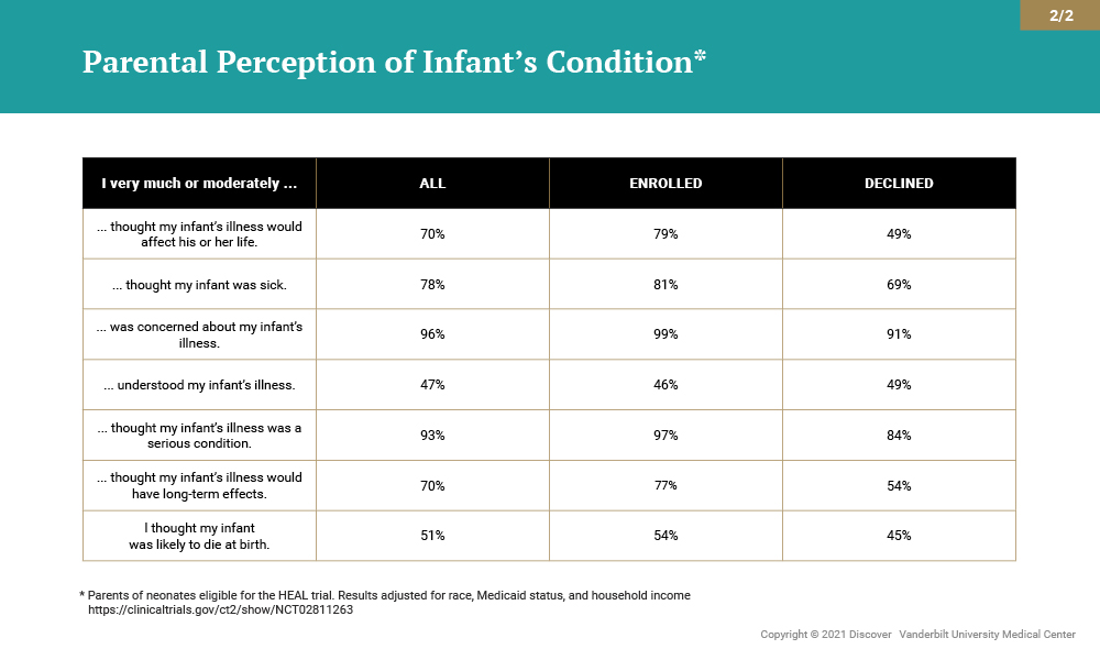 At Vanderbilt, either Anani or Erin Havrilla, R.N., a nurse manager in neonatal services, approached parents of neonates eligible for the HEAL trial. They asked for the parent’s enrollment decision soon after the child’s birth, generally a time of great distress for new parents with sick infants. The HEAL trial required consent within 24 hours, while the decision study portion allowed for consent in 5 to 7 days.