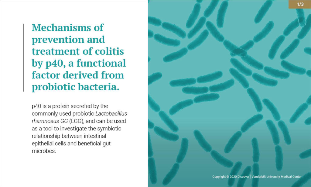 Yan and colleagues were the first to identify a novel mechanism of communication by which LGG promotes the survival of intestinal epithelial cells. In subsequent studies, they showed that p40 promotes intestinal epithelial homeostasis through specific signaling pathways. Notably, they found that p40 activates epidermal growth factor receptor, promoting normal intestinal development, and upregulates production of immunoglobulin A, a key defense against intestinal disease.