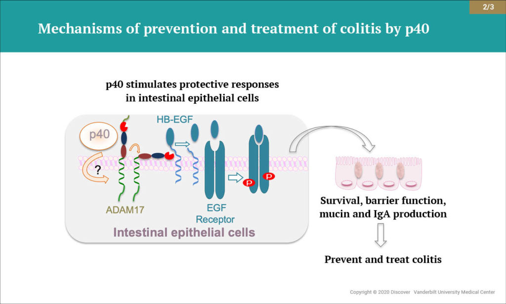 The researchers expanded their scope and demonstrated that therapeutic delivery of p40 to the colon of mice using a hydrogel bead system reduced intestinal inflammation. Further, they found that p40 supplementation in early life protected against intestinal inflammation and injury in adult mice. The new study builds on this research.