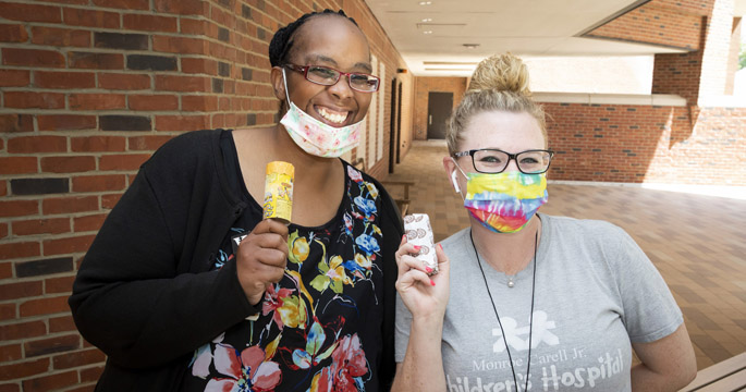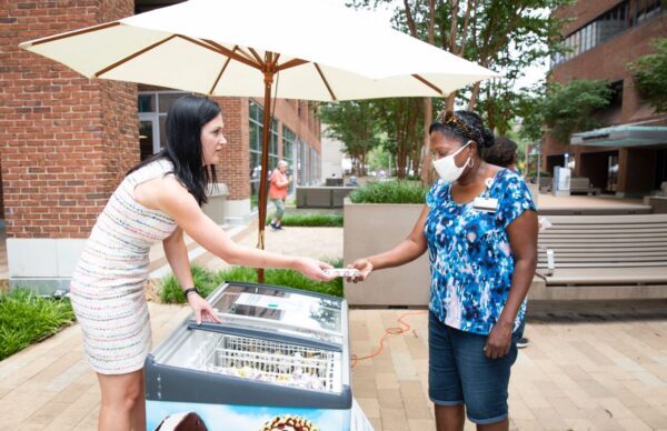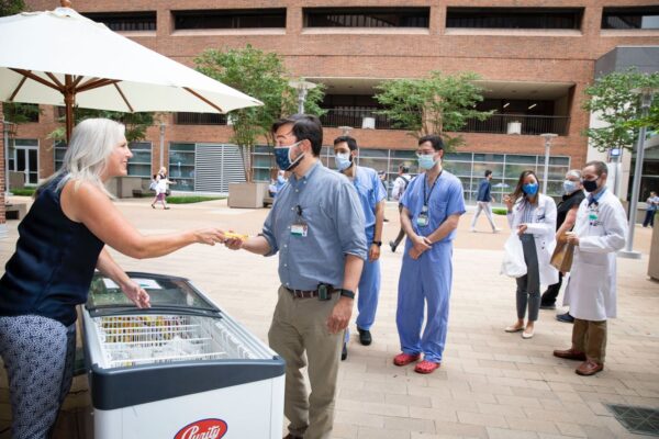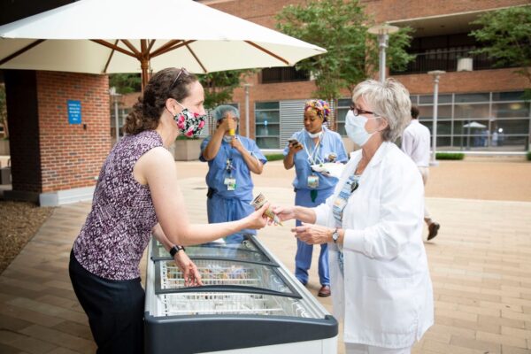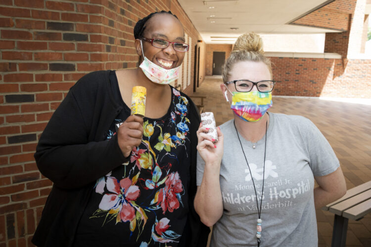 The VUMC Chill Out free ice cream event on July 30 was socially distanced and outdoors and was a big success, with more than 10,000 frozen treats distributed during its six hours. Ice cream treats were also delivered to employees at One Hundred Oaks, Vanderbilt Wilson County Hospital, Vanderbilt Bedford County Hospital and Vanderbilt Tullahoma Harton Hospital.