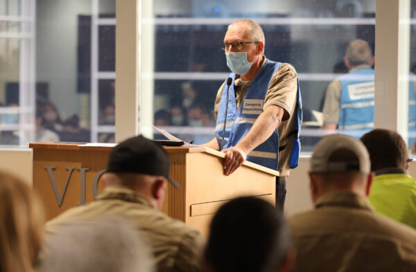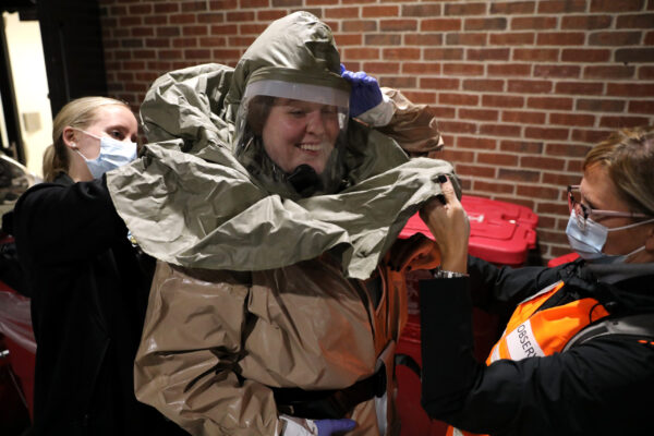 But saying this was “just” a drill doesn’t do the occasion justice, as each of the 80 individuals who took part – from Emergency Preparedness staffers Tim Hunter and Alex Mindel, to the Facilities Management staff who rapidly set up the outdoor space, to those suited in full hazardous-materials (hazmat) protective gear to aid with decontamination, to my fellow-volunteer-shower-takers – took their roles seriously.