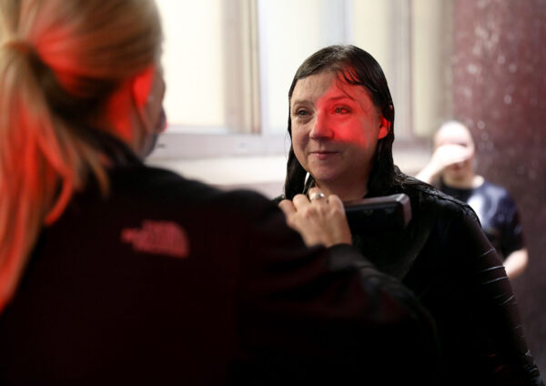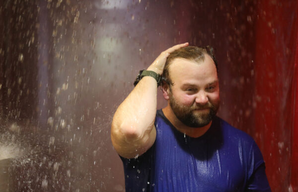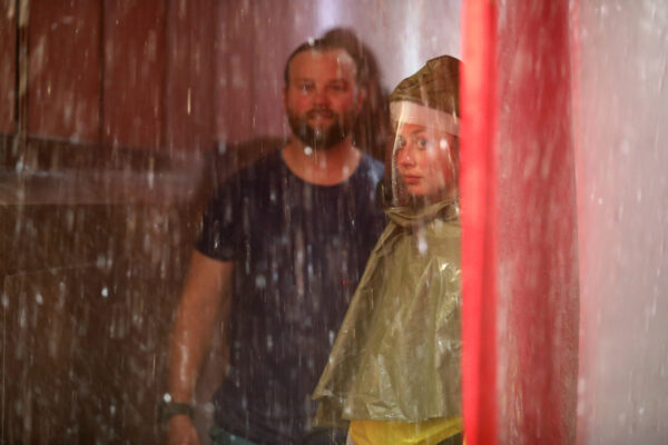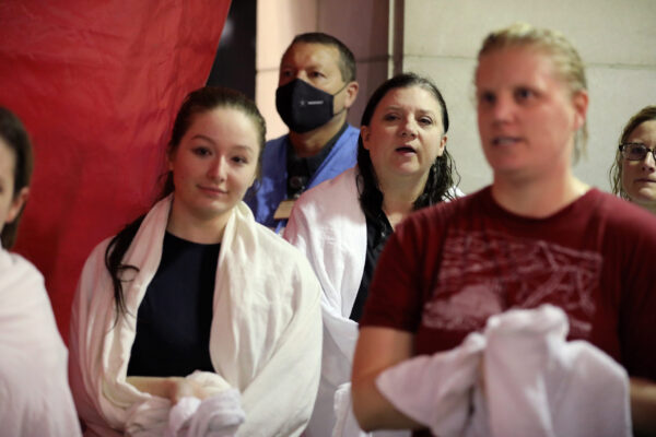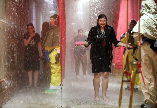 The water’s deluge made hearing next to impossible, so the hazmat-garbed volunteers waved showering individuals through, assisting as needed. A large traffic signal — somewhat disturbingly similar to those at the exit of an automatic car wash — provided a visual signal to indicate when each person’s water rendezvous was complete.