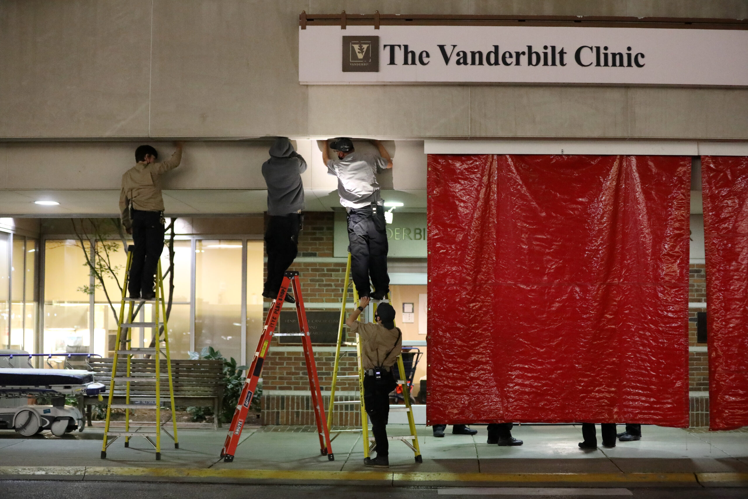 For the decontamination exercise, the shower area included 10 shower heads mounted in the ceiling above the sidewalk outside The Vanderbilt Clinic entrance. Ordinarily, the shower heads are tucked behind ceiling panels, and you’d never know they existed.