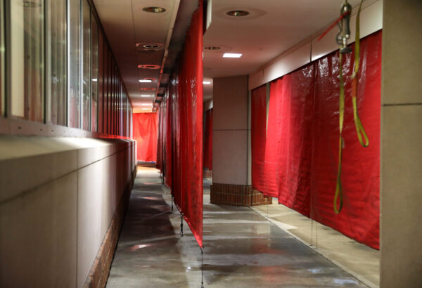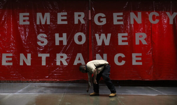 Giant, red tarpaulins were dropped down from the ceiling and attached to the floor to create private shower corridors, with men on one side, women on the other. Patients who could walk – or ambulatory patients – entered the showers from the right side, stripping “contaminated” outer clothing and grabbing soapy sponges from buckets to begin scrubbing beneath the brisk spray.