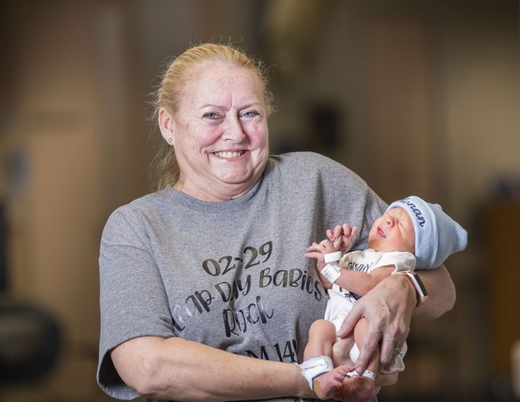 Children’s Hospital neonatal nurse practitioner Wendy Araya, a Leap Day baby herself, greets Ronan Riley, one of seven Leap Day babies born at VUMC Feb. 29, 2020. Photo by Susan Urmy