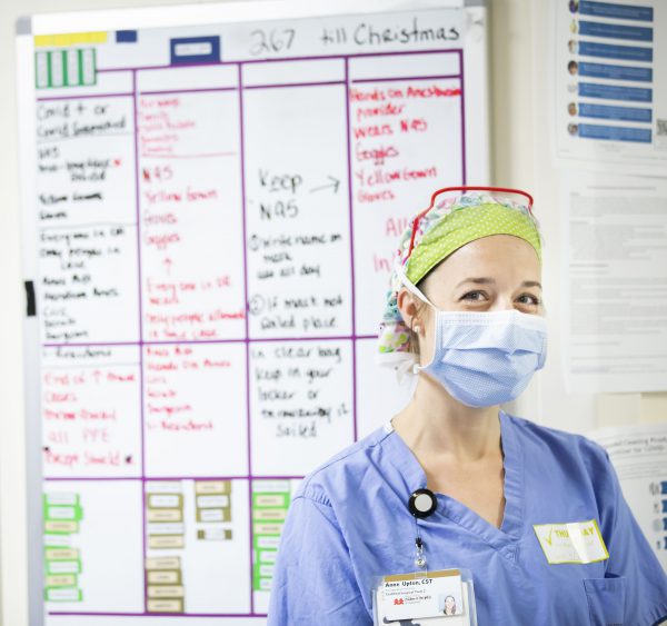 Almost everyone is wearing a mask now, but, as Anne Upton, CST, a surgical tech at Children’s Hospital, shows, a true smile makes it all the way to the eyes. Photo by Susan Urmy
