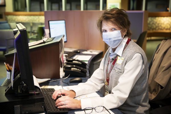 Charon Finnerty-Tucker of Guest Services on duty to greet people on the third floor of Children’s Hospital. Photo by Susan Urmy.