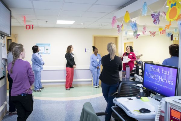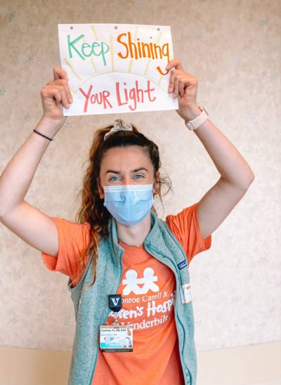 The love and respect isn’t just coming from outside the Medical Center — it’s being passed within VUMC, too. Staffers of the Pediatric Intensive Care Unit at Children’s Hospital knew that their counterpart in the Medical Intensive Care Unit at Vanderbilt University Adult Hospital were coping with a difficult time, so they sent some treats and also some love. Courtney Hall, RN, of PICU passes on some encouragement. Photo courtesy the employees of PICU. A story about the inter-ICU shout out is here.