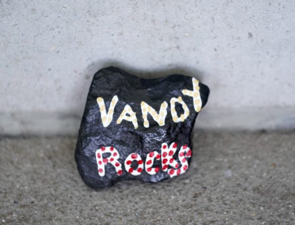 As employees make their way into work, they now pass painted rocks with supportive words and phrases along walkways leading to VUMC entrances. Photo by Donn Jones. A story about the employees who painted and placed the rocks is here.