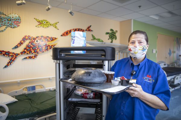 Candas Roberts, of Nutrition Services at Children’s Hospital, is one of many dedicated employees delivering meals to patients’ rooms. Photo by Susan Urmy