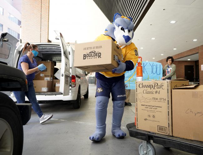 Employees of the Medical Center have received numerous donations of food and other expressions of thanks and support from our community. Here, Nashville Predators mascot Gnash helps load food donated by the Predators from the Frothy Monkey to VUMC employees. Photo by Donn Jones. To read more about food donations to VUMC, go here.