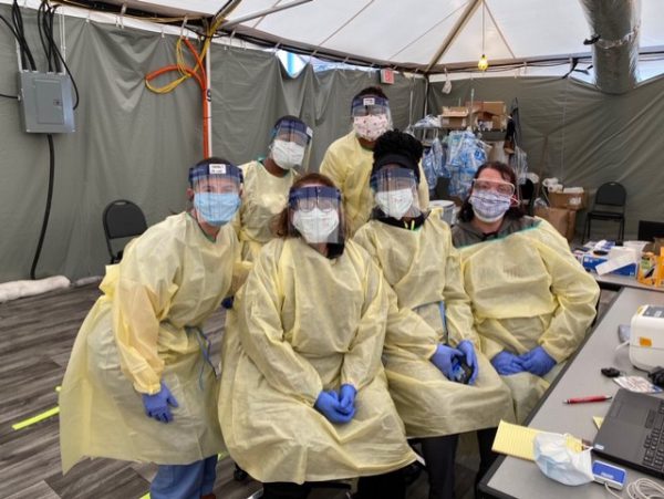 VUMC opened COVID-19 testing centers around the region at walk-in clinics, and also at a dedicated location dubbed the Glenrose testing center. This group portrait with PPE was furnished by Shakeya Bean, second from right. A story about how she volunteered to work in a COVID testing center despite recent tornado damage to her home is here.