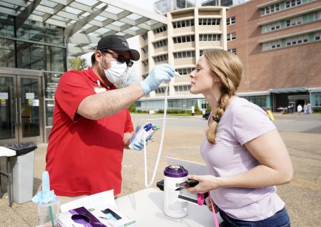 An important part of VUMC’s response to COVID-19 has been the willingness of employees to pitch in wherever needed as the situation changed —including the parking valet attendants training to take temperatures of employees as they come to work. VUMC Valet attendant Richard Alicea performs a temperature screening on employee Logan Decker, DVM. Photo by Donn Jones. A story about the valet attendants and their new role is here.