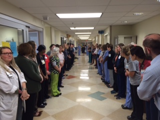 But, unknown to her, behind her room curtain the hallway was abuzz with quiet excitement as medical staff lined the hallways on the 5th floor Cardiovascular Intensive Care Unit. Jaszmon was there, wearing her black cap and gown; the school officials Heaston and Chadwell and the nurses Taylor and Jagoda were out there too.
