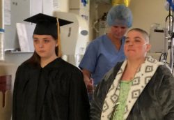 The Kenwood school officials, Heaston and Chadwell, wearing their cap and gowns, appeared at a podium in the doorway of the hospital room and held a short ceremony as the mom and daughter held hands.