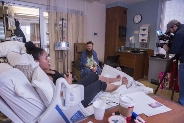 Joshua Surovey visits with Renee Bruens in the hospital, shortly after she had donated one of her kidneys to him. He had lost more than 100 lbs. to make himself medically eligible for the transplant, and then tirelessly advertised for a donor around his home town of Clarksville before Renee saw and responded to one of his appeals. The transplant occurred in April. Photo by Anne Rayner