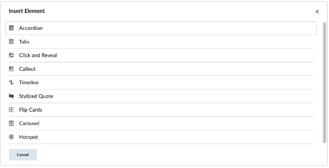 This guide uses Accordions as an example for how to insert an Element, but the steps you will follow are the same for all Elements and Practices.  To insert a new Element or Practice into a Content page in your course, follow the instructions below: