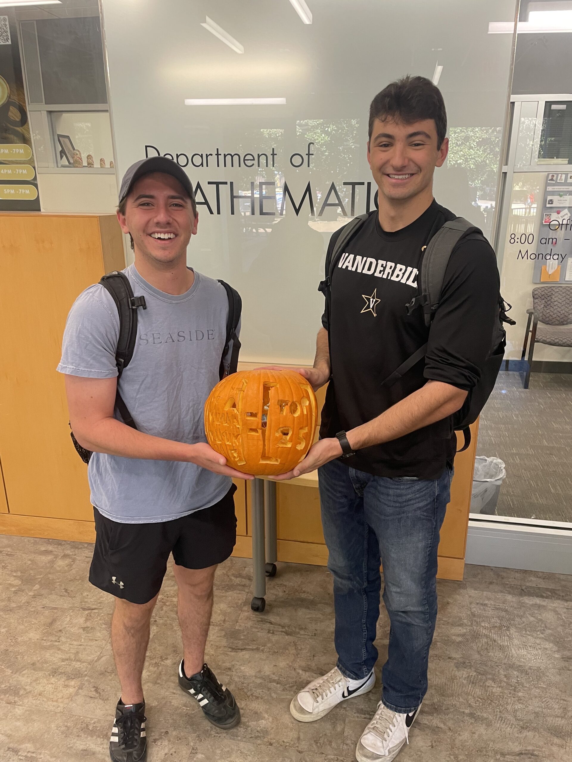 On October 24, 2024, the Math Department hosted a Hot Chocolate and Hot Apple Cider extravaganza at the department. In the Stevenson 1 lobby, students were treated to tasty beverages, made hot to go! Students, faculty, and staff also participated in a design-your-own-pumpkin contest. The winner of the contest was Griffin Sims, and undergraduate who designed with friends a pumpkin in honor of Vanderbilt Football’s meteoric rise to prominence this year. Griffin was awarded a Math Department hoodie for his efforts. Thanks to the staff, especially Helen Cannon and Anna McDaniel, for organizing and hosting such a great event!