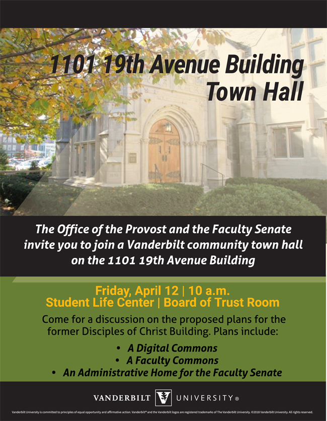 Provost and Vice Chancellor for Academic Affairs Susan R. Wente will host an April 12 town hall in partnership with the Faculty Senate to discuss proposed uses of an architecturally notable building located at 1101 19th Ave. South (the former Disciples of Christ Historical Society building). The building was acquired by the university in 2015.