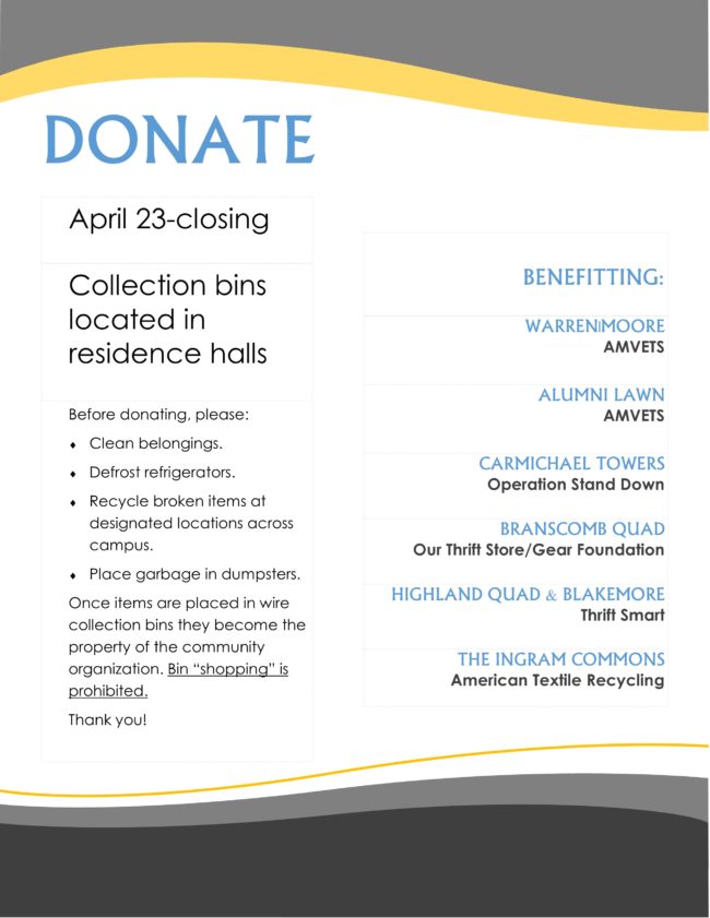 Housing Facilities is pleased to offer our Move-out Donation Drive program again this year. Bins will be available Mon., Apr. 23 through Closing!