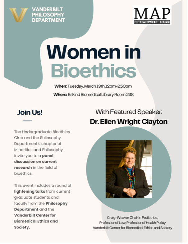 Featured speaker: Dr. Ellen Wright Clayton. Co-sponsored by MAP and the Undergraduate Bioethics Club for a panel discussion on student and faculty research in bioethics.