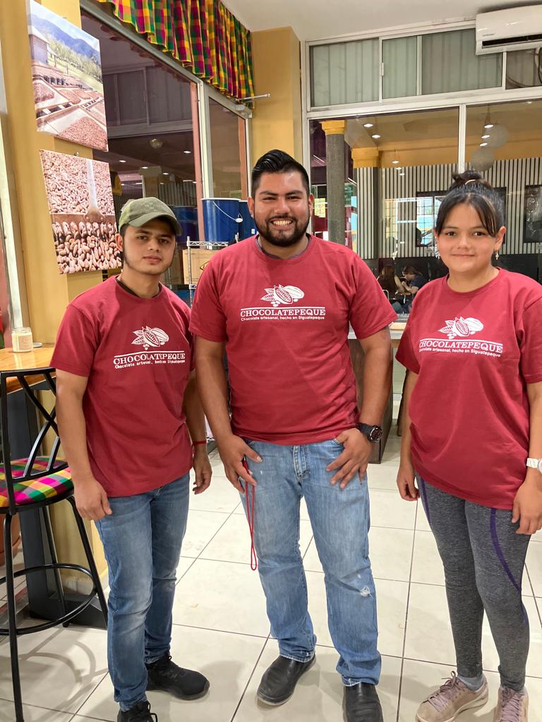 Part of the Chocolatepeque factory team that makes all the chocolate. (From left to right) Luis, Eric, and Libny.