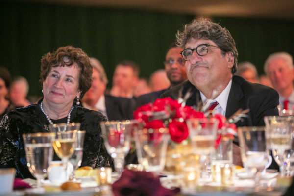 Chancellor Emeritus Nicholas S. Zeppos (r) and his wife Lydia Howarth at a Nov. 8 celebratory dinner in his honor. (Anne Rayner/Vanderbilt University)
