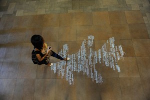 The lobby in Central Library, the floor of which features an interactive graphic comprised of search terms being entered in real time by library visitors (Credit: Creative Services)