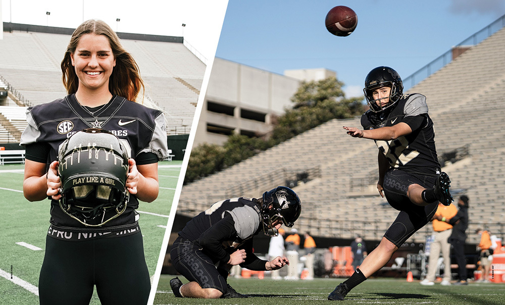 Senior student-athlete Sarah Fuller became the first woman to play in a football game in the Southeastern Conference and for a Power Five program when she kicked off at the start of the second half against the University of Missouri on Nov. 28. The history-making squib kick was celebrated across the sports world, drawing praise on social media from Los Angeles Dodgers pitcher and fellow Commodore David Price, ’09, tennis legend Billie Jean King, NFL quarterback Russell Wilson, soccer star Carli Lloyd, and many others. Fuller, who made history again two weeks later against the University of Tennessee when she became the first woman to score in a Power Five game, also was chosen to introduce Vice President Kamala Harris during a televised prime-time presidential inauguration event on Jan. 20. “All I want is to be a good influence to the young girls out there because there were times that I struggled in sports,” says Fuller, who normally serves as goalkeeper for the recently crowned SEC Champion Vanderbilt soccer team. “But I am so thankful I stuck with it.” Photos by Erica Duane and Joe Howell.