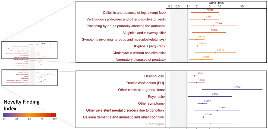 A “Novel Finding Index” guides researchers to significant associations that may be clinically relevant but have not been well-studied in medical literature. The index gives well-known disease associations a low ranking.