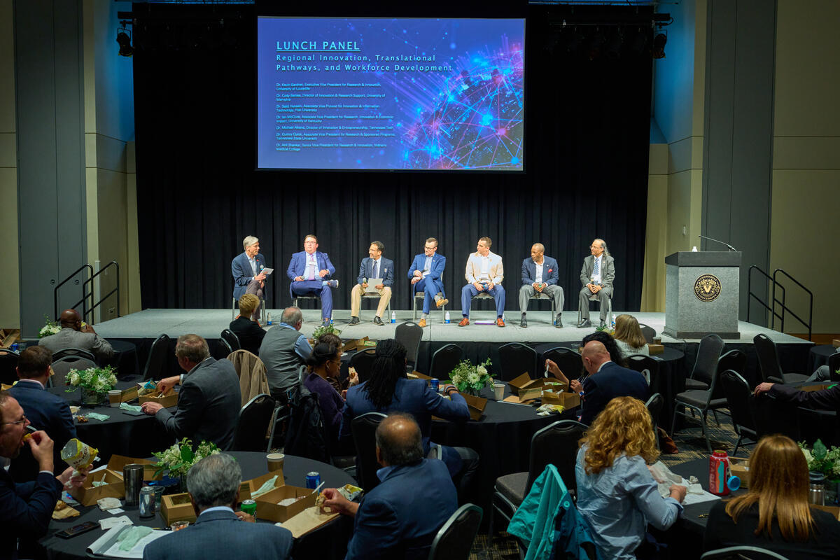 The event featured a keynote conversation with Erwin Gianchandani moderated by Vanderbilt’s Padma Raghavan, vice provost for research and innovation, and Deborah Crawford, vice chancellor for research, innovation and economic development at the University of Tennessee.  Also featured was a panel discussion on regional innovation, translational pathways and workforce development moderated by Kevin Gardner, executive vice president for research and innovation at the University of Louisville, with panelists Michael Aikens, director of innovation and entrepreneurship at Tennessee Tech University; Cody Behles, director of research and innovation at the University of Memphis; Sajid Hussain, associate vice provost for innovation and information technology at Fisk University; Ian McClure, associate vice president for research, innovation and economic impact at the University of Kentucky; Quincy Quick, associate vice president for research and sponsored programs at Tennessee State University; and Anil Shanker, senior vice president for research and innovation at Meharry Medical College. In addition to panels, the showcase’s 170 registrants also participated in a poster session with over 30 faculty and student presenters from the participating universities.
