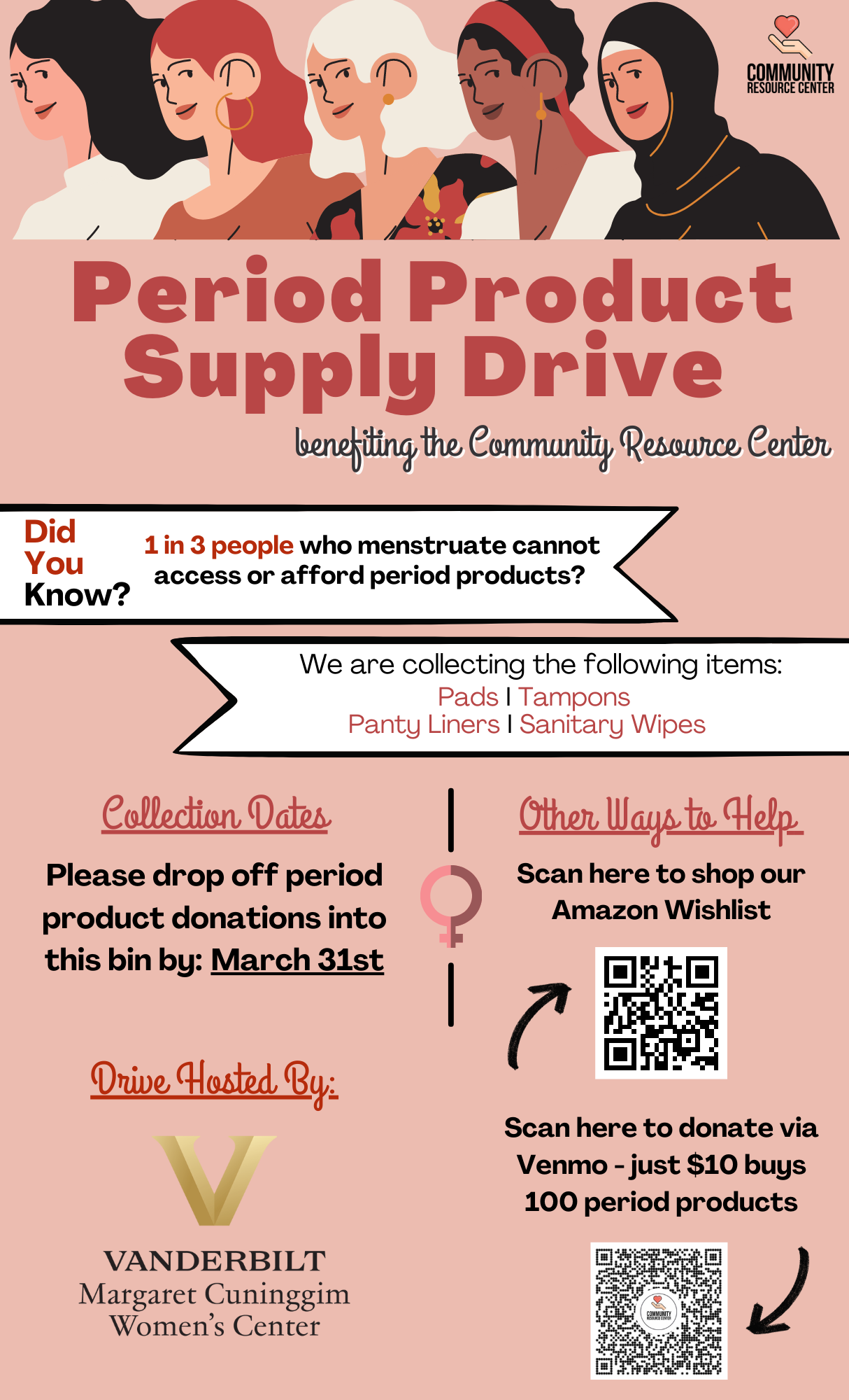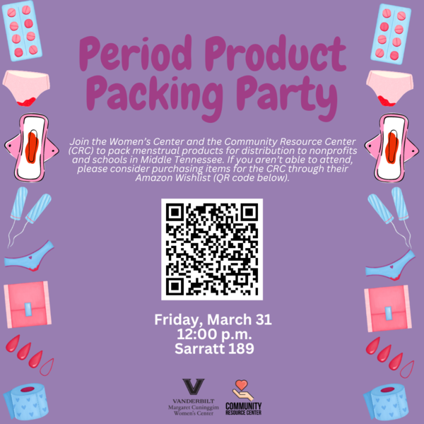 The drive will culminate in a Period Product Packing Party on Friday, March 31 at noon. Attendees will pack menstrual products for distribution to nonprofits and schools in Middle Tennessee. In addition to dropping products in collection bins, Vanderbilt community members may purchase items for the Community Resource Center through its Amazon Wishlist.