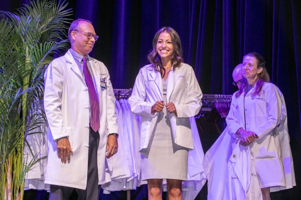 Jeffrey Balser, dean of the Vanderbilt University School of Medicine, and Jessica Quintos Day at her White Coat ceremony in 2021 (Vanderbilt University)