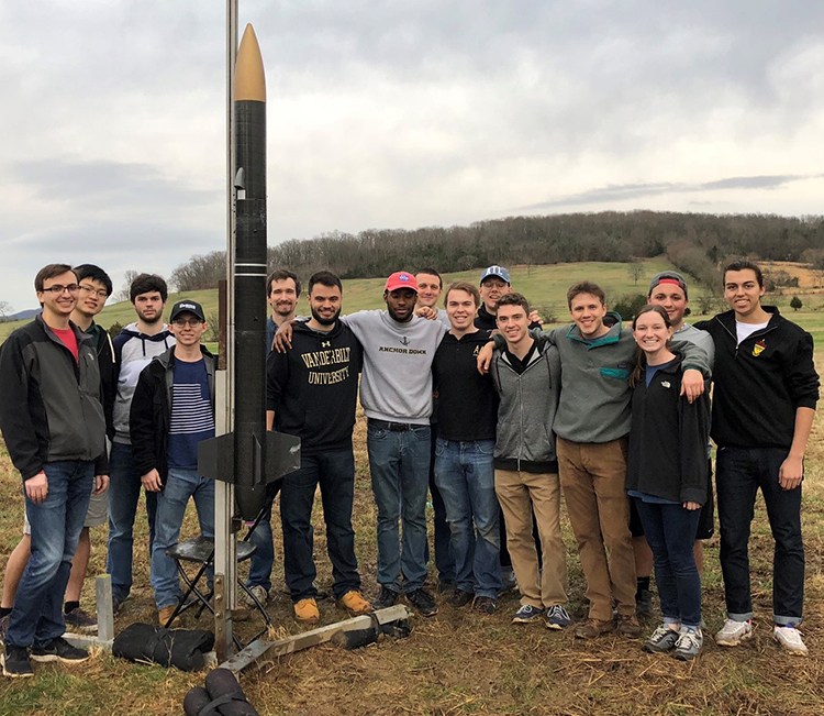 Members of the 2017-18 Vanderbilt Rocket Team: (L-R) Nick Galioto, Winston Du, Morgan Byrd, Jered Trujillo, Ben Gasser, Dominic Ghilardi, Xavier Williams, Will Pagano, Daniel Schneller, Peyton Fite. Kurt Lezon, Taylor Parra, Katie Hornbeck, Spencer Kallor, and Henry Bristol.