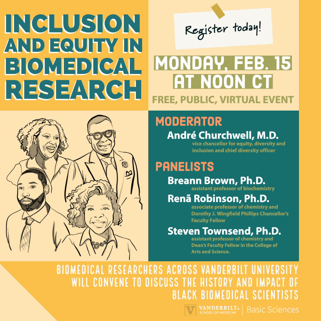 Biomedical researchers across Vanderbilt University will convene to discuss the history and impact of Black biomedical scientists on Monday, Feb. 15, at noon CT. The virtual discussion, “From Inclusion to Equity: The Story of Black Biomedical Scientists,” will be moderated by Dr. André L. Churchwell, vice chancellor for equity, diversity and inclusion and chief diversity officer.