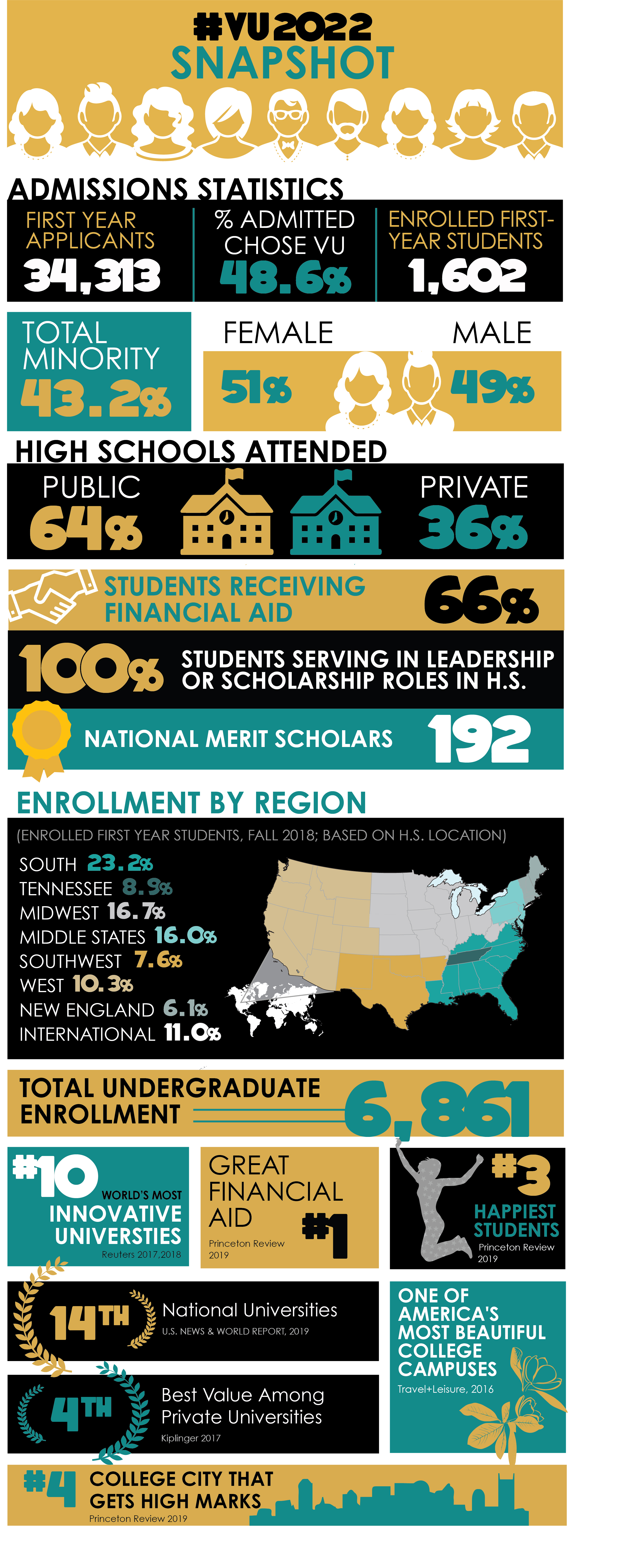 Vanderbilt University’s Class of 2022—by the numbers—has several notable distinctions. This first-year class is the most selective in the university’s history, with an acceptance rate of 9.6 percent of all students. Undergraduate Admissions had received 34,313 applications, the largest number ever for the first-year class.