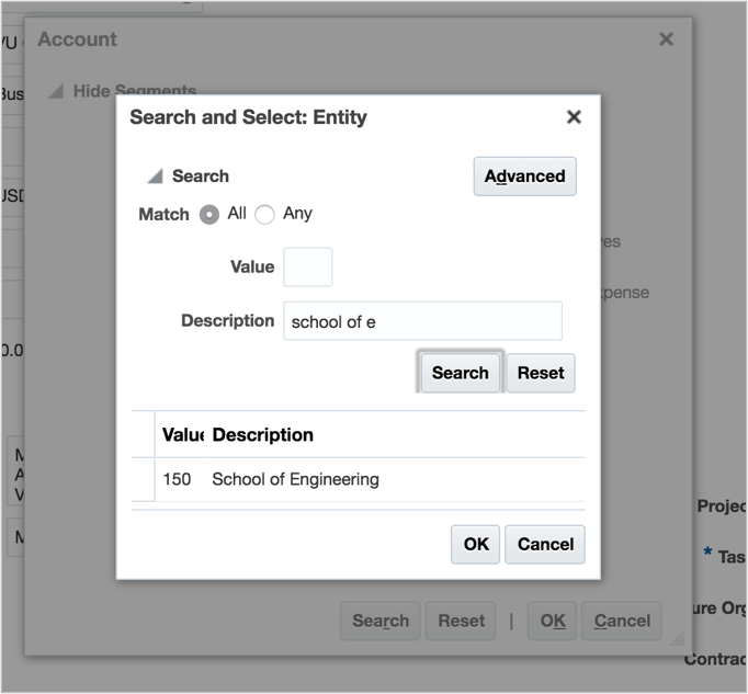 2. Enter your Expenditure Type Value. By clicking the drop down arrow beside the expenditure type field, you will be given the option to search for your expenditure type. Save the requisition once the expenditure type and organization have been entered correctly. Example: You have identified an expense type as a "Books and Subscription Expense". In the search field, you type "Book" and click search. You then receive an item in the search results with the description "Books and Subscription Expense" and the value, "BooksSubsc". Select this item.