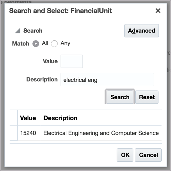 Example: See below for reference of an updated COA string that will be routed to the Electrical Engineering and Computer Science Department FUM.