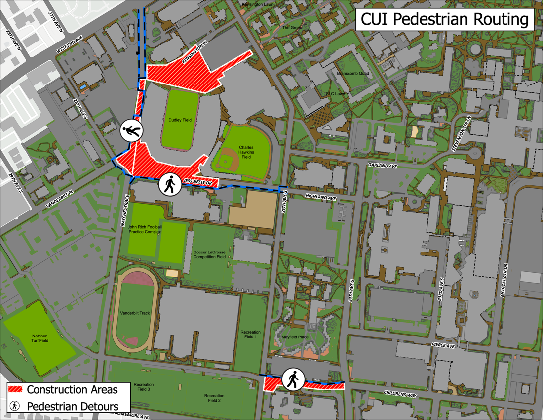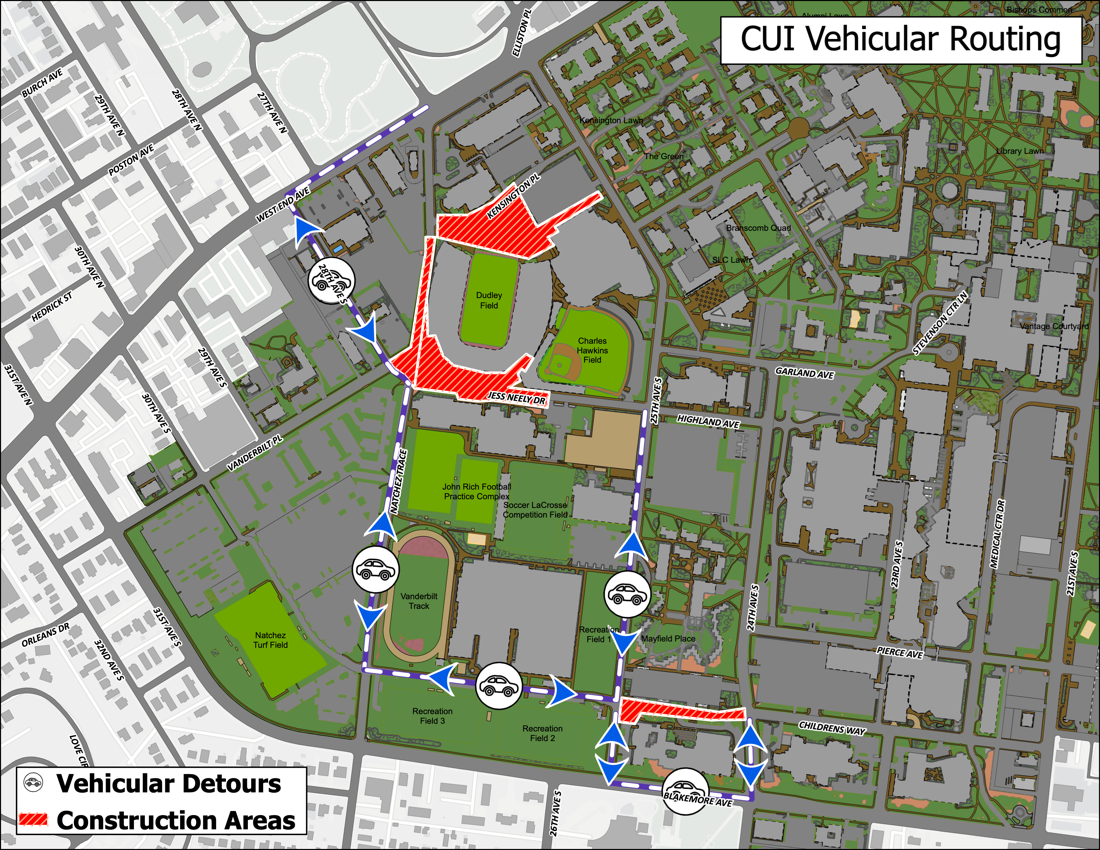 This closure is part of Phase 2 of Vanderbilt University’s Central Utilities Initiative, which supports construction projects in the Frist Athletics Village. The initiative will provide utility enhancements in support of Vandy United projects, the residential colleges to be built along 25th Avenue South and other future university projects. Please refer to the maps below for the latest routes.