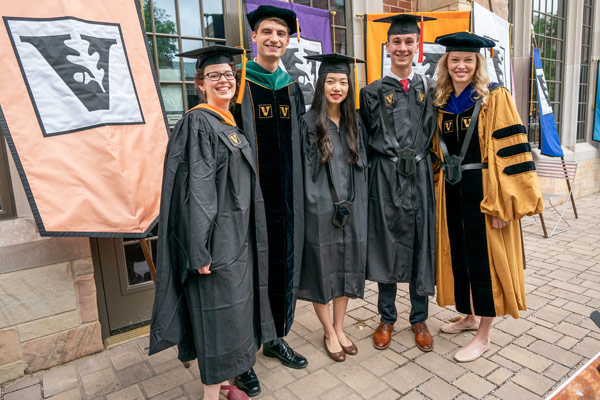 Natalie Gale (left), a Nurse-Midwifery/Family Nurse Practitioner MSN student, was VUSN’s Banner Bearer. Here she waits with other banner bearers for the procession.