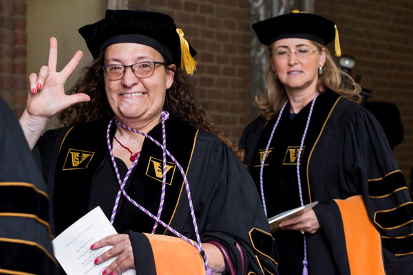 Norman, who is also the Valere Potter Menefee Professor of Nursing, spoke to Master of Science in Nursing and Doctor of Nursing Practice graduates and guests during investiture ceremonies held at Branscomb Quadrangle on Friday, May 10. The class included 348 MSN and 56 DNP graduates. An additional five PhD in Nursing Science graduates were honored in separate Vanderbilt Graduate School ceremonies.