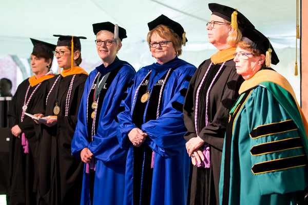 School of Nursing faculty watch as the graduates process in. Left, Paddy Peerman, MS; Marilyn Dubree, MSN; Mavis Schorn, PhD; Betsy Weiner, PhD; Pam Jones, DNP; Dean Linda Norman, DSN.