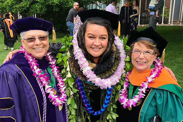 NNP Director Karen D’Apolito, DNP graduate Misty Smith and Dean Linda Norman. Smith, who is from Hawaii, presented celebratory leis to D’Apolito and Norman.