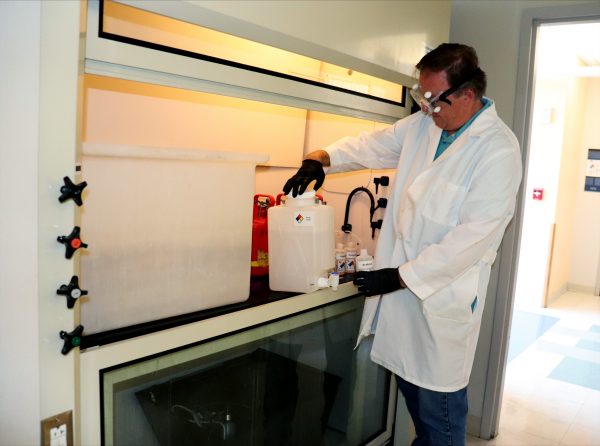 Vanderbilt chemistry students presented the idea of installing distillation machines in laboratories across campus to encourage the recycling of the acetone, which is used daily for cleaning and removing contaminants from glassware. The pilot project began in the organic chemistry labs, where approximately 20 to 30 liters of acetone are used per week. With the installation of just one distillation machine, Vanderbilt is saving up to 650 liters of acetone per week, reducing the amount of hazardous waste the university generates.