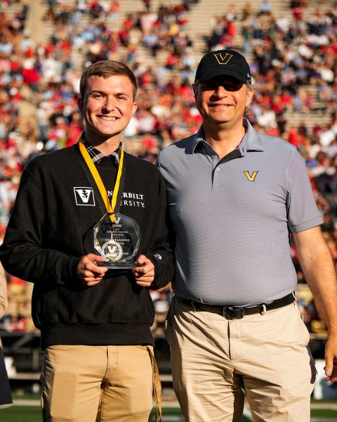 Outstanding Senior winner Blake Christiansen and Chancellor Daniel Diermeier at the Commodores Homecoming game on Oct. 8.