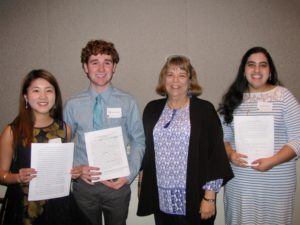 Symposium presenters and moderator celebrate after panel on “Meaning Making from Symbols and Praxis.” Left to right: Jiayi Hu (’17), Matthew Shorten (’20), English Professor Sandy Solomon, Lydia Yousief (’17).
