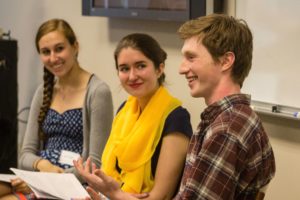 Left to right: Alex Wolfe (’18), Arianna Yeatts-Lonske (’17), and Wyatt Prominski (’17) field audience questions in their creative writing panel on “The Family.”